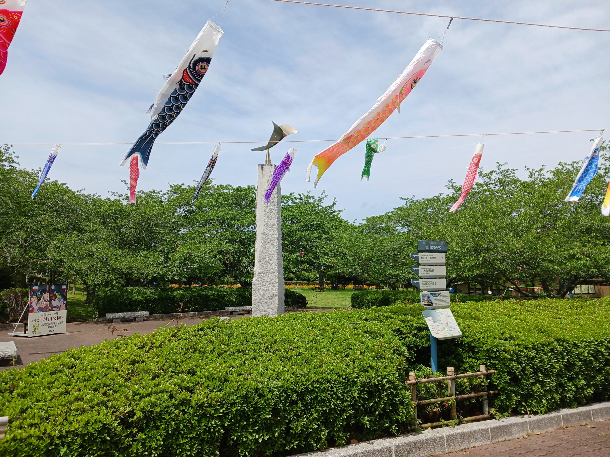 城山公園のツツジは見頃をすぎました。現在は瑞々しい青葉と鯉のぼりが陽光に輝いています。