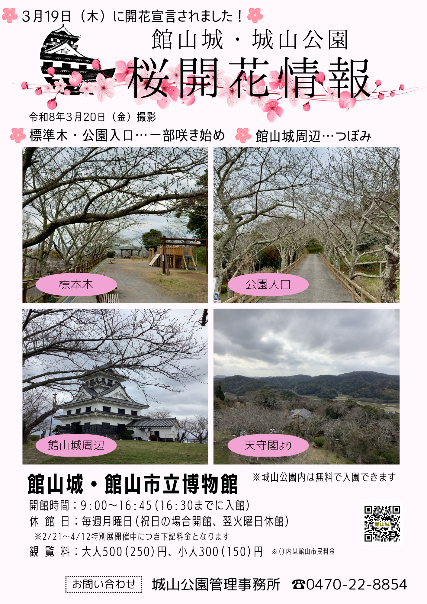 3月19日(木)に開花宣言されました。城山公園内はまだつぼみが多いですが、気温が上がると開花も進みそうです。